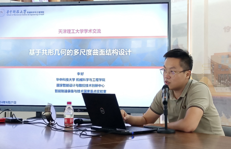 李好为学生们带来《基于共形几何的多尺度曲面结构设计》学术报告。他以复杂曲面构件设计为例,讲解了典型曲面构型的共形参数化建模、多尺度优化设计、拉胀超材料填充的优化设计等理论和方法,并介绍了典型多尺度复杂曲面结构件及其填充材料微结构的建模——分析——优化过程。