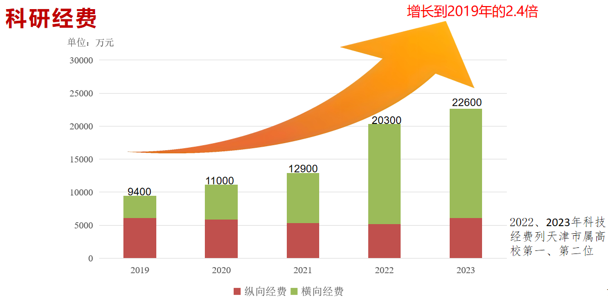 自学校第二次党代会以来,获批国家重点研发计划、自然科学基金、社会科学基金等382项。2023年国家自然科学基金项目立项数(50项)再创历史新高,立项数在天津市综合类地方高校中获批项目数排名第一。2022年、2023年科技经费位居市属高校第一、第二位,形成了4个“亿元级”科研项目群。2018年以来,科研经费增长2.4倍,由2018年的9400万元增长到2.26亿元。高水平理论创新成果不断攀升,发表的国际一区论文从2019年的86篇增长到2023年的201篇,增长2.3倍。研究人员在Nature、Science国际顶刊发表论文6篇。近5年累计获批省部级以上科研奖励41项。2021年,电气电子工程学院(现为电气工程与自动化学院)教授张宝峰联合天津大学等单位共同研发的“多轴联动多传感器协同现场坐标测量技术及应用”成果荣获国家科技进步奖二等奖,米兰时隔七年再度获批国家级科技成果奖励。