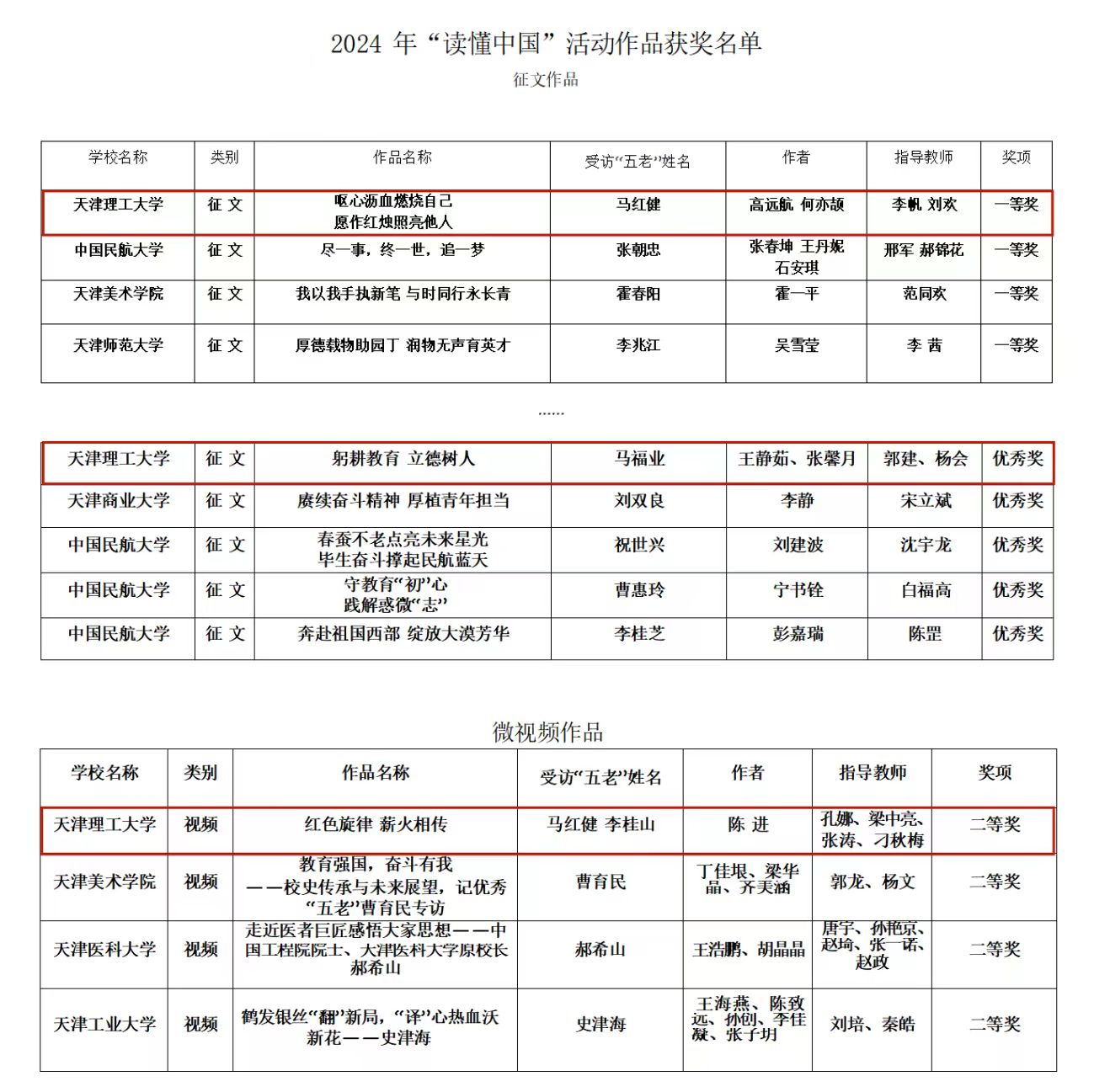 近日,市教育系统关心下一代工作委员会《关于公布2024年“读懂中国”活动评审结果的通知》(津教关〔2024〕16号)公布,米兰关工委选送的2篇征文、1个微视频荣获佳绩。其中,材料科学与工程学院关工委选送的《呕心沥血燃烧自己 愿作红烛照亮他人》获得征文类一等奖,语言文化学院关工委选送的《躬耕教育 立德树人》获得征文类优秀奖,校关工委选送的《红色旋律 薪火相传》获得视频类二等奖。