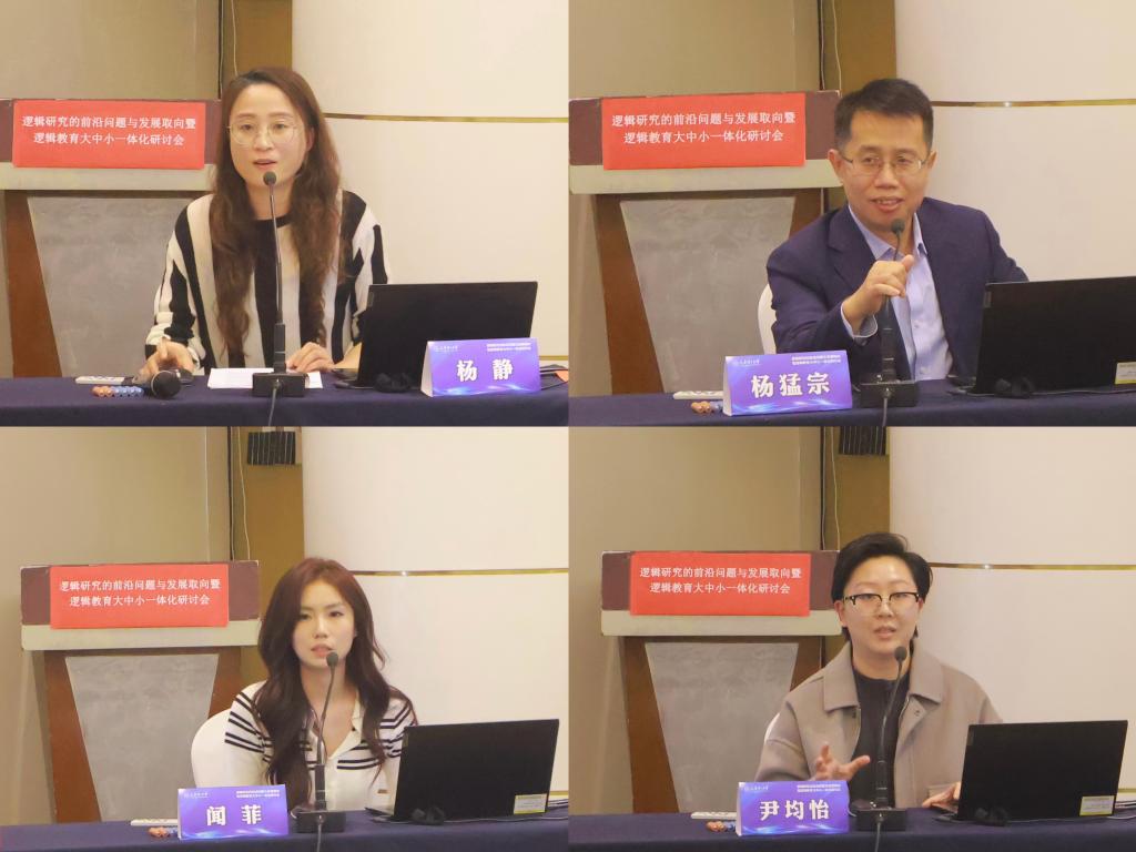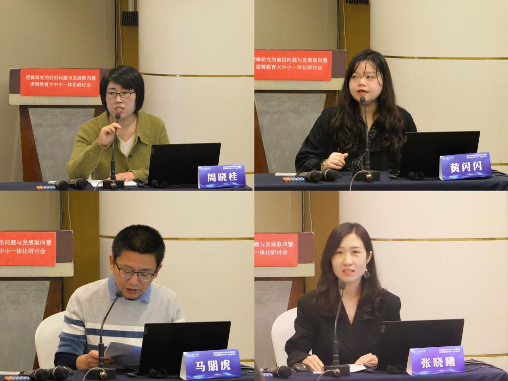 学术报告共分两个阶段,十余位专家学者和师生进行了汇报。在深入推进大中小学思想政治教育一体化建设交流环节,天津师范大学教师周晓桂、马克思主义学院教师黄闪闪、天津市第一零二中学教师马朋虎、南开中学滨海生态城学校教师张晓曦、东丽区南开公能小学教师杨静分别作了题为《数智时代赋能高校逻辑教学创新路径探析》《如何解决大学与中学思政课教材内容重复问题 以“矛盾”概念教学设计为例》《高中思政<逻辑与思维>教学:挑战与对策》《知新知难知不足 勤修乐教促提升——高中逻辑与思维教学中的几点思考》《小学数学教学中逻辑思维能力的培养》的学术报告,并从教学工具、教学教材、教学方法和教学思维四个维度对如何提高逻辑教育教学的实效性进行交流。