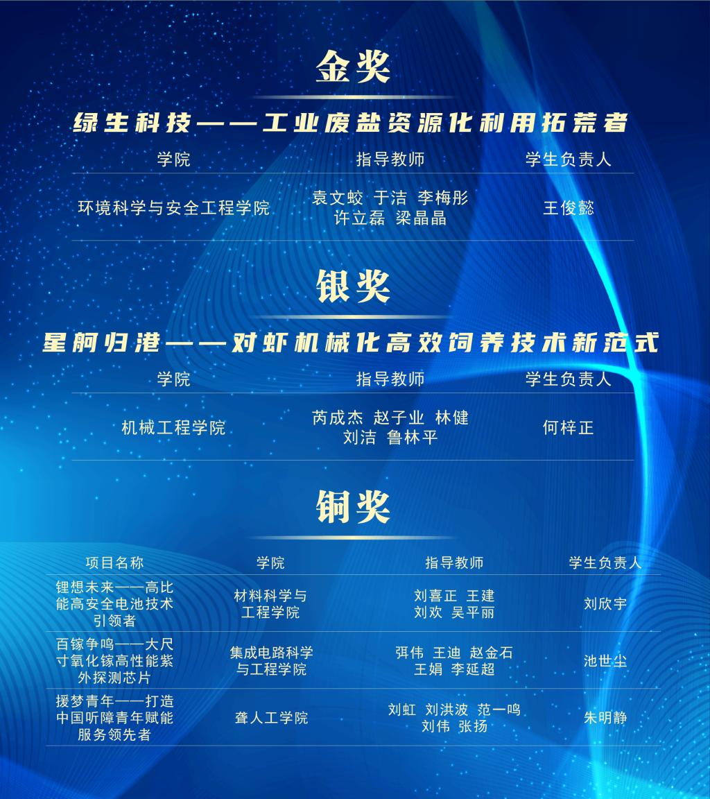 经过校级初赛、省级复赛和全国决赛初评,米兰两个项目入围全国决赛终审答辩环节。其中,环境科学与安全工程学院推报的“绿生科技——工业废盐资源化利用拓荒者”项目荣获全国金奖;机械工程学院推报的“星舸归港——对虾机械化高效饲养技术新范式”项目荣获全国银奖;材料科学与工程学院推报的“锂想未来——高比能高安全电池技术引领者”项目,集成电路科学与工程学院推报的“百镓争鸣——大尺寸氧化镓高性能紫外探测芯片”项目,聋人工学院推报的 “援梦青年——打造中国听障青年赋能服务领先者”项目均获全国铜奖。