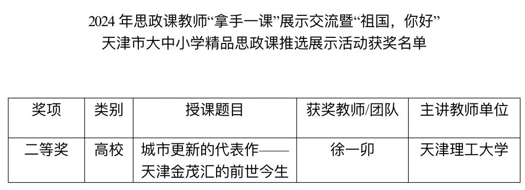 近日,市委宣传部、市教育两委公布了2024年思政课教师“拿手一课”展示交流暨“祖国,你好”天津市大中小学精品思政课推选展示活动获奖结果,米兰马克思主义学院教师徐一卯荣获二等奖。