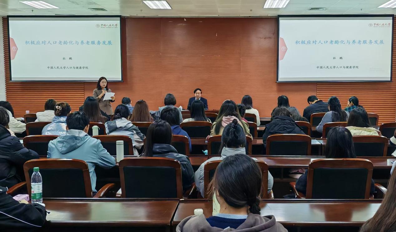 杜鹏作了题为《积极应对人口老龄化与养老服务发展》的学术报告。他深入分析了中国老龄社会新阶段的特征与面临的挑战,就积极应对人口老龄化等问题提出了富有建设性的观点。报告结束后,他与同学们就少数民族地区老龄化、互助养老、老龄文化建设等内容展开了积极交流,现场气氛热烈。