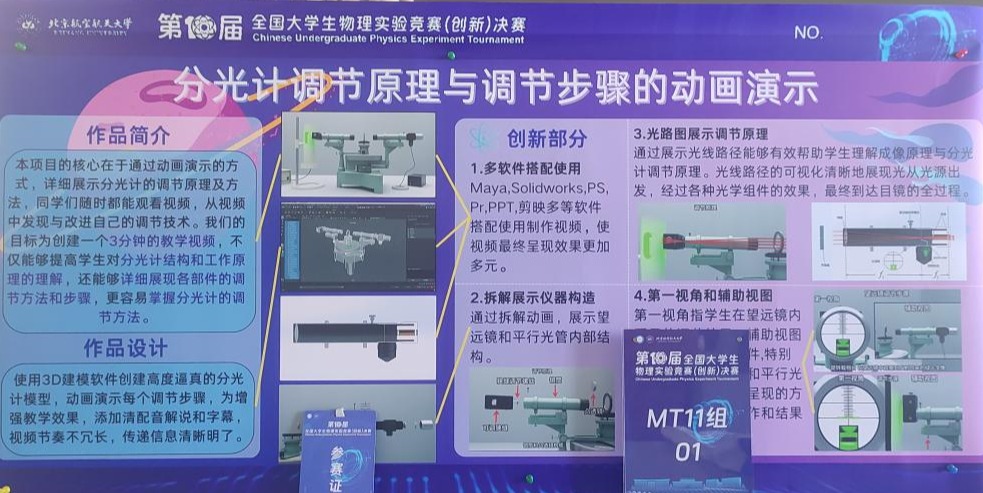 自赛事开展以来,米兰充分发挥学科优势,积极组织学生报名参赛,进行相关培训。参赛学生涵盖理学院、集成电路科学与工程学院、材料科学与工程学院等多个学院。经过校赛、市赛复赛及网络评审等环节,8支参赛队伍参加市赛,并荣获市级一等奖1项、市级二等奖4项、市级三等奖3项。最终,学校4支队伍被推荐参加全国总决赛。经过参赛师生的悉心准备和精彩现场展示,由物理实验中心教师李晓兰指导,学生赵朝源、马福祥、陈祥瑞、张逸成参与的《分光计调节原理与调节步骤的动画演示》作品获自选命题类全国决赛一等奖;由物理实验中心教师于丹指导,学生冯杰、贾云博、廖海琅参与的《空气中声速的测定》作品获讲课类全国二等奖。