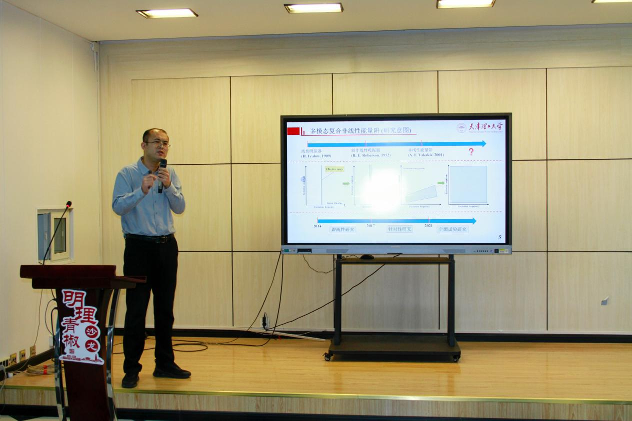 陈建恩以“非线性振动能量传递特征与控制研究”为题,介绍了强非线性吸振器、声振非互易性和机械湍流三项研究中的能量传递调控方法、三个研究方向的相互联系、研发历程以及成果优势等内容。