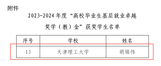 近日,教育部高校学生司(高校毕业生就业服务司)公布了2023—2024年度“高校毕业生基层就业卓越奖学(教)金”获奖人选名单。学校艺术学院2018届本科毕业生胡锦伟获此殊荣。