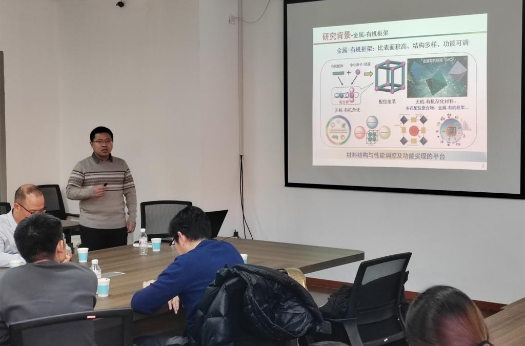庞建东作了题为《锆基金属—有机框架孔道环境调控与性能研究》的学术报告。他针对金属—有机框架(MOFs)材料孔道环境的精准控制和调节这一领域难题,提出了利用配体构象控制框架拓扑类型和拓展组分数量调控孔道环境的整体研究思路,实现了具有特定孔道特性的MOFs材料的定向构筑及其孔道环境的精确调节;发展了多组分MOFs可控组装的策略,实现了多种功能基元在配位框架孔道中的有序配置和孔道环境的精准设计与调控;所构筑的材料在光催化、气体吸附与分离等领域展现出良好的应用潜力。