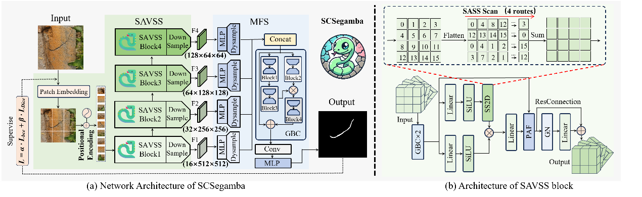 《SCSegamba: Lightweight Structure-Aware Vision Mamba for Crack Segmentation in Structures》论文由学院石凡教授和程徐教授所指导的2023级硕士研究生刘辉撰写,通讯作者为贾晨博士后。该研究提出了一种面向边缘设备优化的轻量化结构感知视觉Mamba网络SCSegamba,通过动态特征建模机制与极简高效的设计实现了复杂场景下的高精度裂缝分割。其核心创新在于首先基于低秩分解与动态门控机制设计了轻量级门控瓶颈卷积,相比于标准卷积,低秩分解使得网络的参数规模和GFLOPs分别降低了64.60%和71.63%,在大幅减少计算需求的同时保持了裂缝形态特征提取能力;结构感知状态空间模块利用创新性的多路径结构感知扫描策略感知裂缝像素之间的拓扑结构邻接关系,提高了特征图的语义连续性,相比于传统的平行扫描策略,在F1和mIoU上分别提高了1.19%和0.84%;此外,轻量级的多尺度特征分割头能够以极低的0.01M参数规模和0.42GFLOPs的计算需求生成有效抑制背景噪声的高质量分割图。该网络模型总体仅具有2.80M参数规模与18.16GFLOPs,特别是与基于轻量Transformer的方法相比,参数规模减少了52.54%。在包含低对比度、多光照条件和复杂背景噪声等挑战性场景的结构裂缝检测数据集上,该网络的F1分数和mIoU指标分别达到了0.8390和0.8479,与次好的方法相比分别提高了2.22%和1.74%,展现出最优性能表现,为边缘计算设备上的实时结构裂缝检测提供了可行的轻量化解决方案。