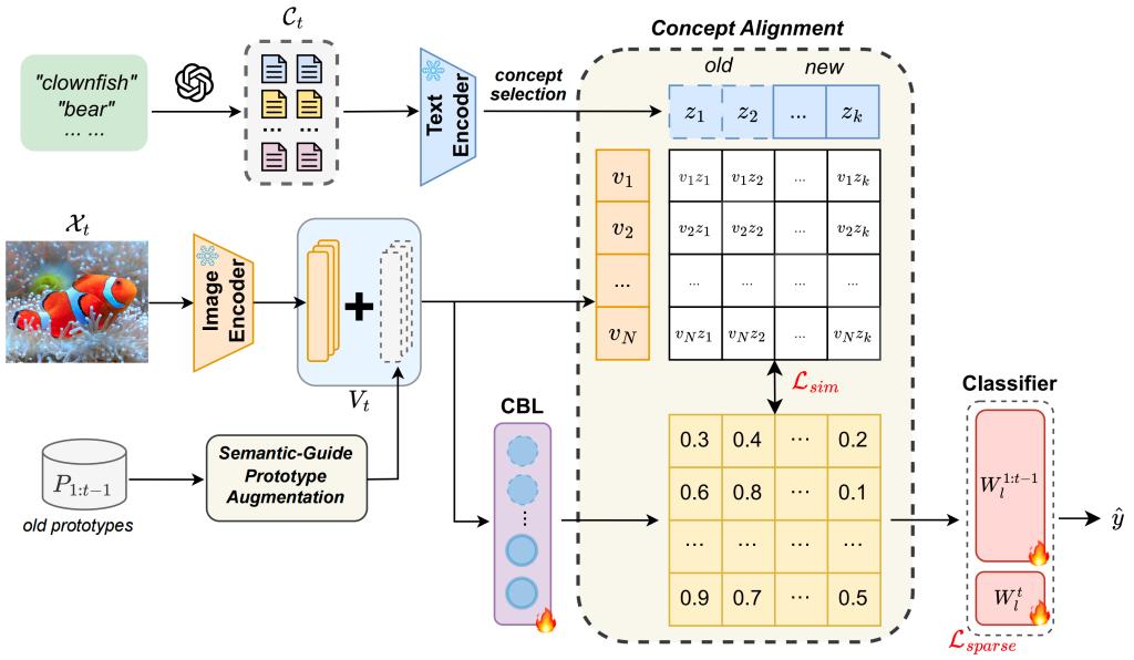 《Language Guided Concept Bottleneck Models for Interpretable Continual Learning》论文由学院余璐副教授以及所指导的2023级硕士研究生韩昊宇撰写。持续学习(Continual Learning)的目标是使学习系统能够不断获取新知识,同时不遗忘先前学习的信息。持续面临的挑战在于缓解灾难性遗忘(catastrophic forgetting)的同时保持跨任务的可解释性。现有的大多数持续方法主要侧重于保留已学知识以提高模型性能。然而,随着新信息的引入,学习过程的可解释性对于理解不断演化的决策机制至关重要,但这一方向却鲜少被探索。本研究提出了一种新颖框架,通过整合语言引导的概念瓶颈模型(Concept Bottleneck Models, CBMs)来同时应对这两大挑战。利用概念瓶颈层(Concept Bottleneck Layer),与CLIP模型对齐语义一致性,从而学习人类可理解且能跨任务泛化的概念。通过聚焦于可解释的概念,不仅增强了模型随时间推移保留知识的能力,还提供了透明的决策洞察。在多个数据集上验证了方法的有效性,其中在ImageNet子集上的最终平均准确率超越现有最优方法达3.06%。此外,通过概念可视化展示模型预测依据,进一步推动了可解释持续学习的理解。