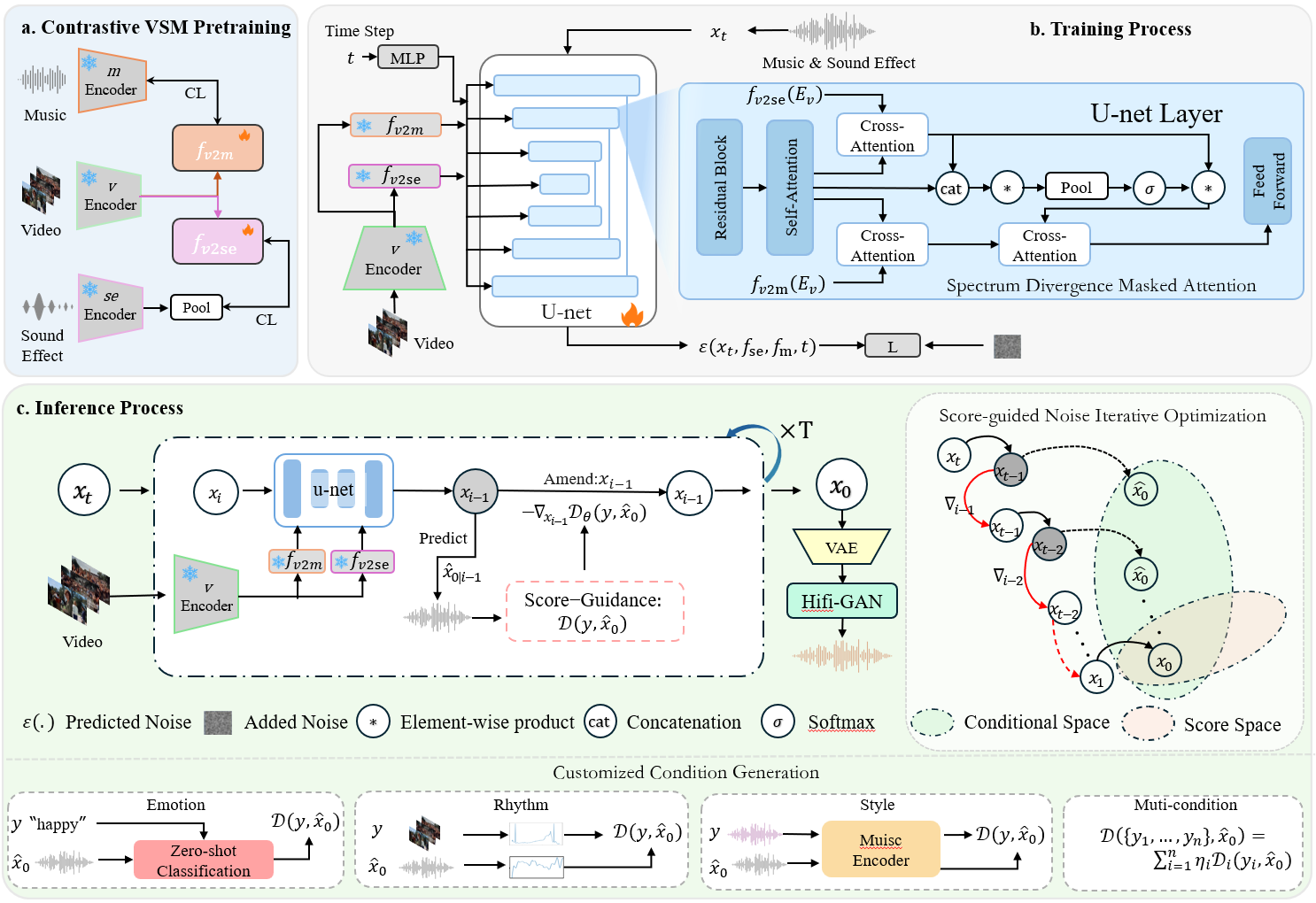 《Customized Condition Controllable Generation for Video Soundtrack》论文由学院亓帆副教授以及所指导的2023级硕士研究生马锟生撰写。该研究针对视频配乐生成领域中音乐和音效问题展开深入研究,提出了一种创新的频谱散度掩码注意力和引导噪声优化的视频配乐扩散模型框架。该框架融合对比视觉—声音—音乐预训练、频谱散度掩码注意力机制以及评分引导噪声迭代优化三大核心模块,有效地将音乐和音效这两种生成条件的模态信息映射到统一的特征空间。通过这一机制,模型在保持音效与音乐独特特性的同时,显著增强了对复杂音频动态的捕捉能力。此外,即便在视频配乐优化条件与视频信息未经复杂学习训练的情况下,该方法仍能为音乐创作者提供高度可定制的控制能力,使配乐生成过程更加灵活高效。