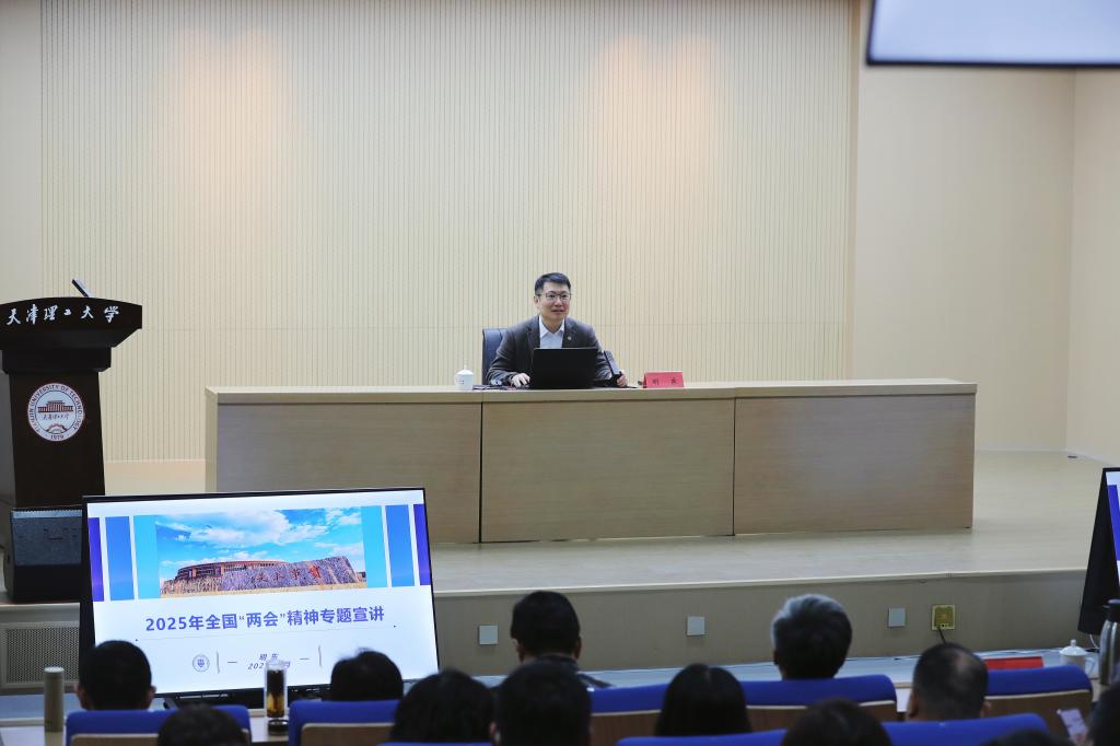 3月26日上午,学校在理学院报告厅举办全国两会精神宣讲报告会,邀请全国政协委员、天津大学副校长明东作专题宣讲报告。校党委副书记、校长练继建出席报告会。校院两级党委理论学习中心组成员、全体处级干部、机关各党支部党员代表参加会议。报告会由校党委副书记许瑞主持。