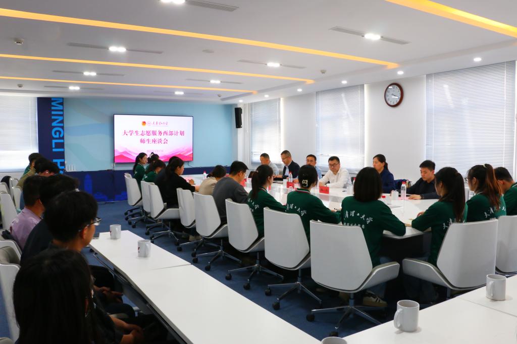 团新疆区委学校工作部部长赛迪艾合买提·亚尔麦麦提,西部计划办公室四级主任科员吕军臣,团昌吉州委大学生志愿服务西部计划工作负责人冯志强,团市委学校部部长魏然和校团委相关负责同志、基层学院团委书记代表、第三届研究生支教团代表、有意愿报名西部计划赴新疆服务的学生代表参加座谈。