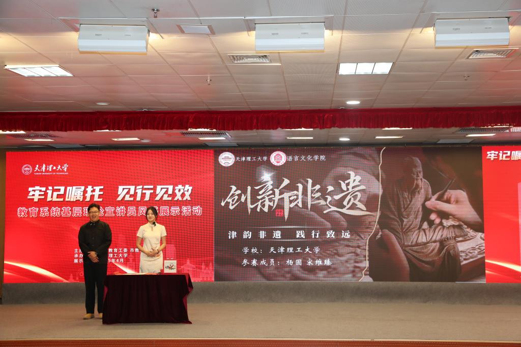 语言文化学院作品《津韵非遗践行致远》以中英双语、传统相声形式展示,用现代语言诠释“包袱”,以生动诙谐的语言,宣讲津派文化,现场反响热烈。