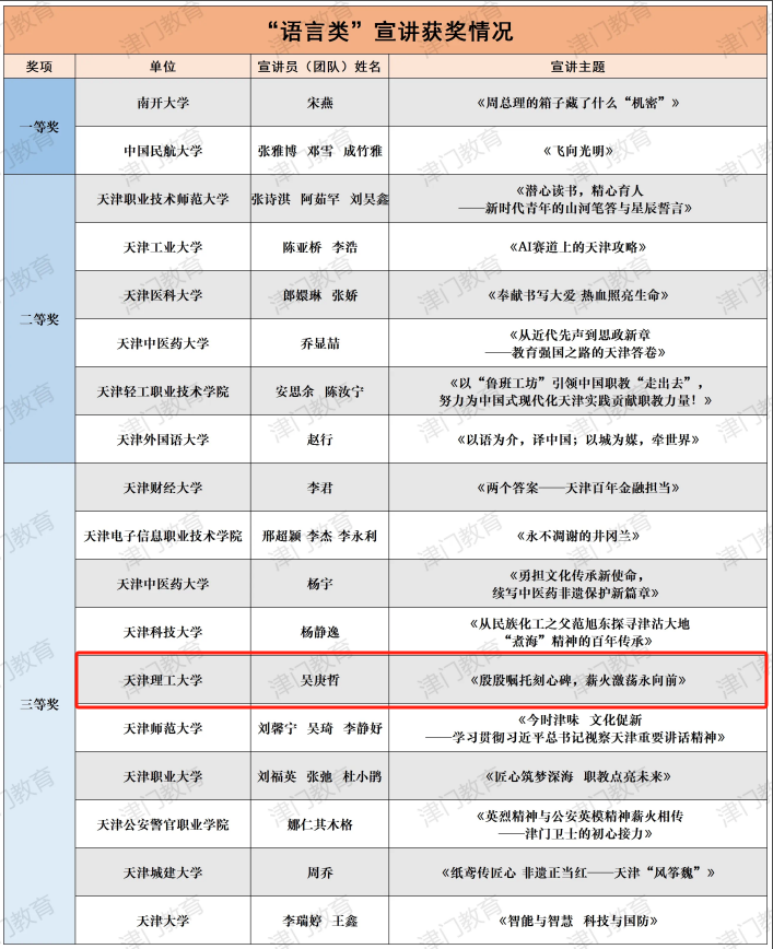 据悉,市委宣传部、市教育两委相关处室负责同志,相关单位宣传部门负责同志参加活动。学校160余名学生现场观看了本次展示活动。下一步,学校将广泛组织师生理论宣讲员深入基层一线开展面对面交流、互动化宣讲,倾情讲好新时代中国故事、天津故事和教育故事,让党的创新理论落地生根、深入人心。