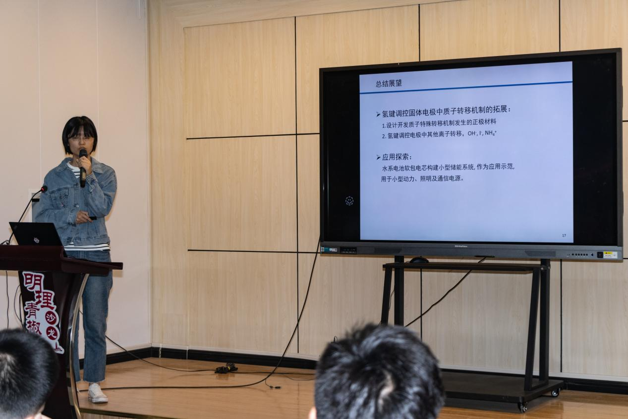 王鲁鲁作题为“氧化钒电极中的质子转移机制研究”的报告。她聚焦含有大量晶格水的层状氧化钒正极,通过理论计算和实验表征探究质子在氧化钒层间的独特配对选择转换转移机制,提升水系电池电化学性能。