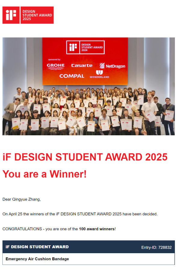 近日,2025年德国IF学生设计奖公布获奖结果。由米兰艺术学院钟蕾教授、张悦群副教授共同指导,2023级艺术专业研究生张清岳设计的作品《急救气囊绷带》(Emergency Air Cushion Bandage)从全球72个国家超7000件参赛作品中脱颖而出,荣获2025年德国IF学生设计奖。