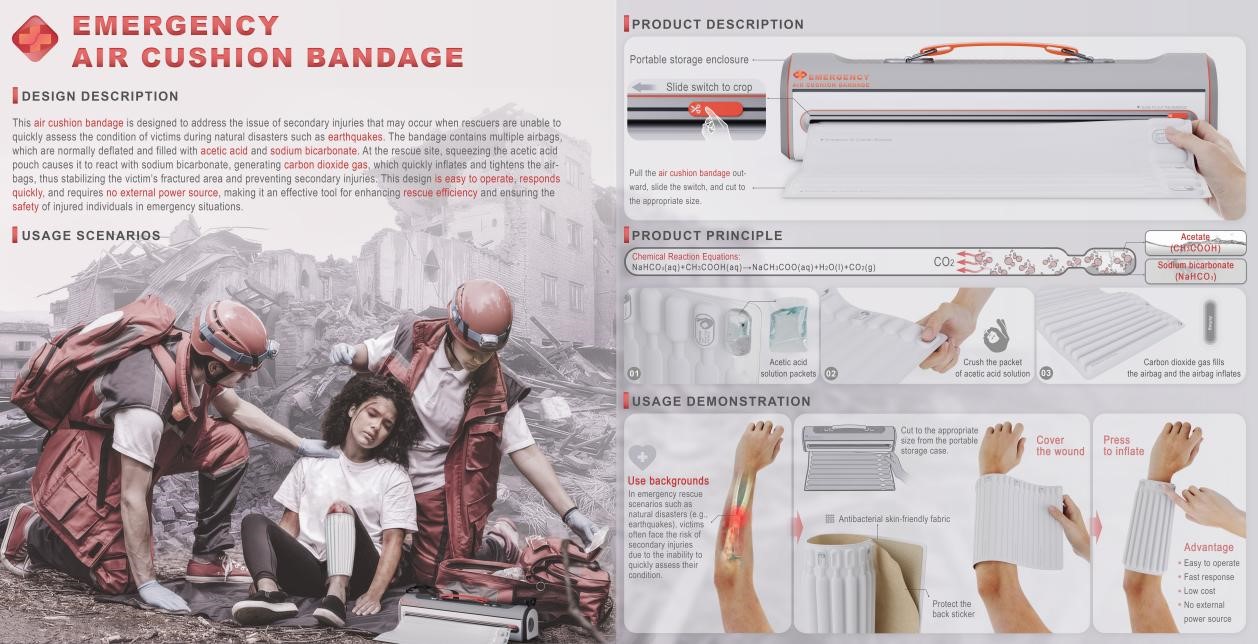 该款急救气囊绷带旨在解决自然灾害(如地震)发生时,救援人员无法迅速评估受害者伤情而可能导致的二次伤害的问题。绷带内设有多个气囊,通常处于平坦状态,节省存放空间,内含醋酸溶液袋和碳酸氢钠。现场救援时,挤压醋酸袋与碳酸氢钠发生反应,产生二氧化碳气体,迅速膨胀并紧固气囊,从而有效稳定受害者的骨折部位,防止二次伤害。该设计操作简便、反应迅速,无需外部能源,为紧急救援提供了高效、安全的支持。