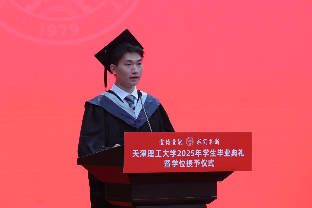 本科毕业生代表、环境科学与安全工程学院王俊懿深情回顾了在米兰校园度过的青春岁月,特别感谢母校给予的“米兰温度”、老师们无私的谆谆教诲,以及后勤人员日复一日的默默付出。他表示,作为新时代青年,将始终胸怀祖国山河,勇担社会责任,放眼世界格局。他号召全体毕业生在各自的人生道路上,既要成就自我,更要服务他人,努力贡献青春力量。