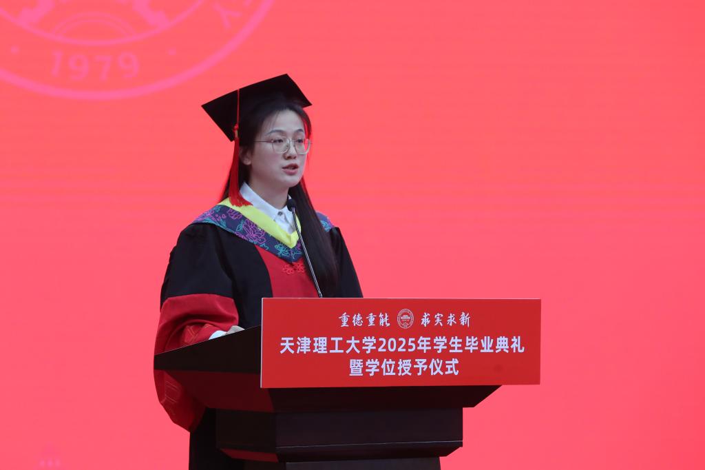 研究生毕业生代表、材料科学与工程学院博士研究生刘浩囡表达了对学校、师长和亲友的崇高敬意与诚挚感谢。她希望大家以“求实”精神夯实根基、以“求新”勇气开拓边界、以“重德”品格铸就脊梁、以“重能”奋斗逐梦时代,将个人理想汇入强国伟业。