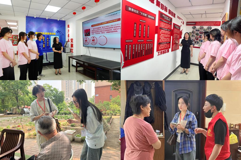 在唐山市景泰社区党群服务中心,实践团深入了解社区治理的精细化运作,结合专业特长为社区改造建言献策。实践团赴天津市津南区光明楼社区、金华南社区,根据公共空间现状、居民实际诉求等展开实地调研,围绕功能优化、文化融入等为社区公共空间提供创意改造方案,形成“专业技能+社区需求”的适配模式,为艺术赋能基层治理提供可借鉴的路径。