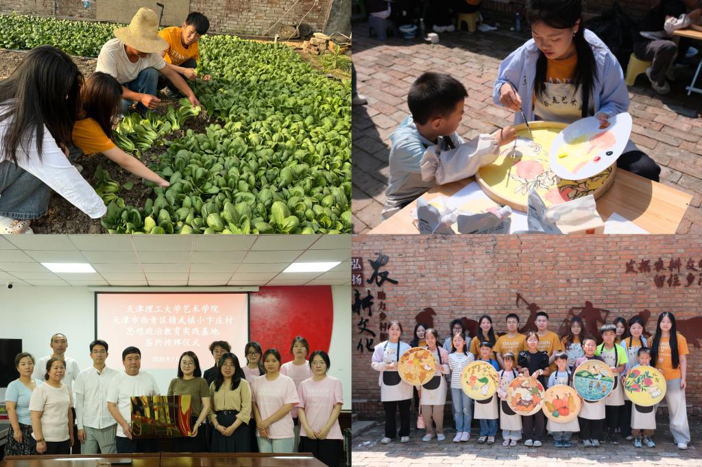 实践团走进西青区小卞庄村,追溯村庄发展脉络,深入田间了解农作物种植销售情况,借助专业所长拍摄助农短视频,为乡村经济发展赋能。带领村内儿童共同绘制二十四节气主题的非遗簸箕画,讲述农耕故事与非遗文化,作品被悬挂于村史馆中,为乡村文化繁荣添彩。学院与小卞庄村签订思想政治教育实践基地共建协议并举办授牌仪式,以艺术为笔续写助农兴乡新篇章。