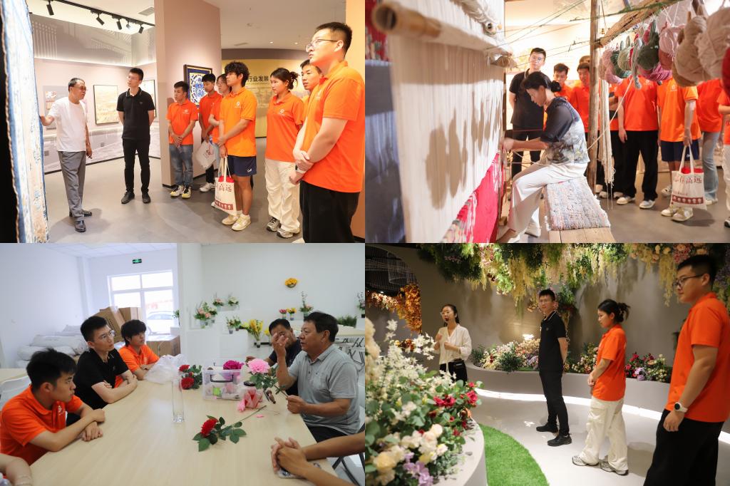 在“地毯之乡”崔黄口镇,实践团走进织采宫——崔黄口地毯文化展览馆。在讲解人员的介绍下,了解百年地毯产业如何成为世界地毯三大产业聚焦区之一。同学们实际触摸各种材质地毯,近距离观看手工织毯;探访曹子里绢花文化园,参观了党建展示、历史沿革、主题展馆、精品展示、电商直播和非遗体验六大功能区;在非遗传承人李秀亭老师与苑泽春老师的讲解下,体验手工绢花的非遗魅力。