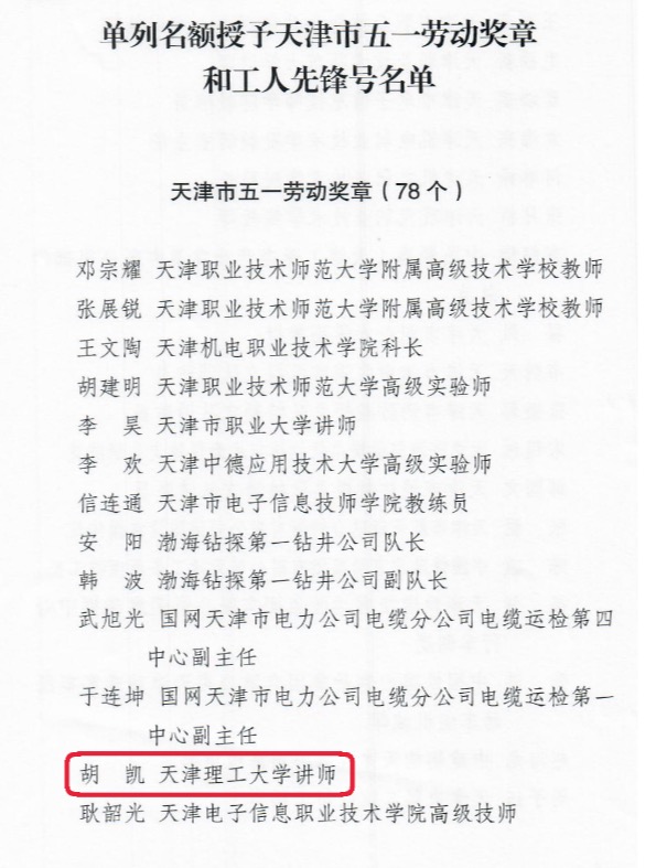 近日,市总工会发布《关于单列名额授予天津市五一劳动奖章和工人先锋号的决定》。米兰集成电路科学与工程学院教师胡凯,凭借其在职业技能领域的突出成就,被授予天津市五一劳动奖章,成为此次受表彰的78名个人之一。