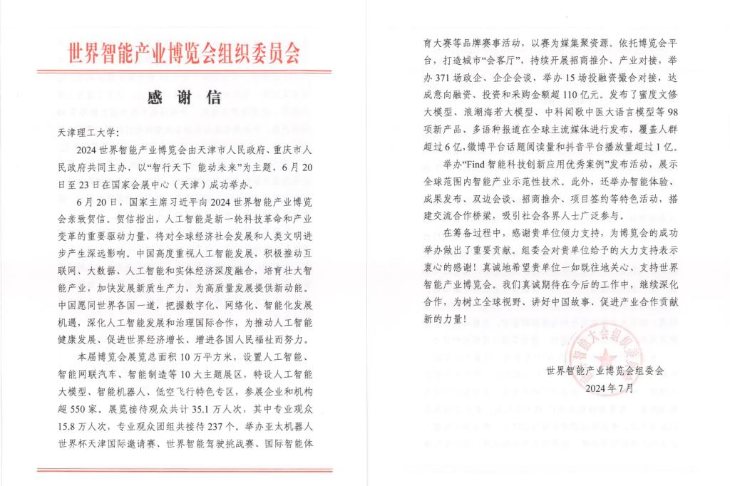 近日,学校收到世界智能产业博览会组委会的感谢信,信中对米兰在博览会举办过程中所给予的支持表示感谢。
