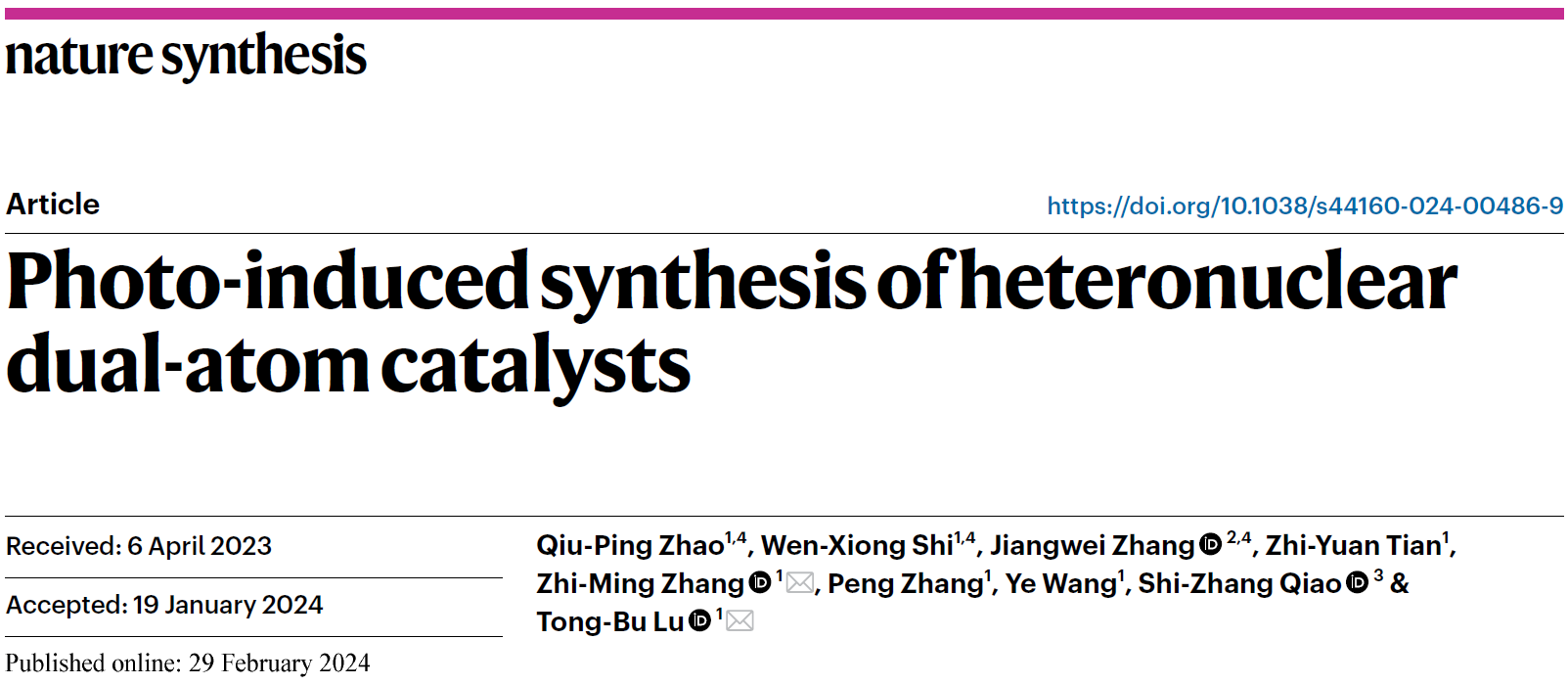 近日,米兰新能源材料与低碳技术研究院张志明&鲁统部教授团队,在国际知名期刊Nature Synthesis上发表题为“Photo-induced synthesis of heteronuclear dual-atom catalysts”的论文。