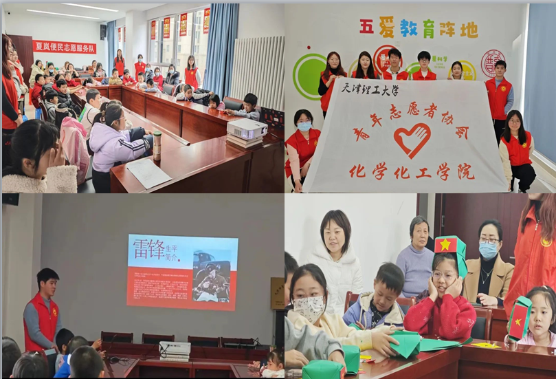 化学化工学院赴北辰区宜兴埠夏岚苑社区、西青区小南河小学,为小朋友们讲述《雷锋日记》,宣讲雷锋精神,教小朋友们制作雷锋帽,锻炼动手能力。