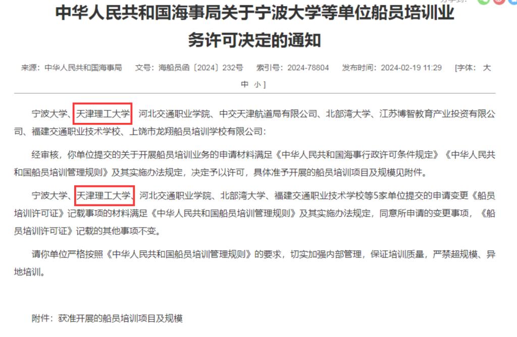 近日,交通运输部海事局发布《中华人民共和国海事局关于宁波大学等单位船员培训业务许可决定的通知》,经审核,米兰船员培训业务许可规模扩大申请符合相关规定,决定予以许可,新的培训合格证有效期至2029年。