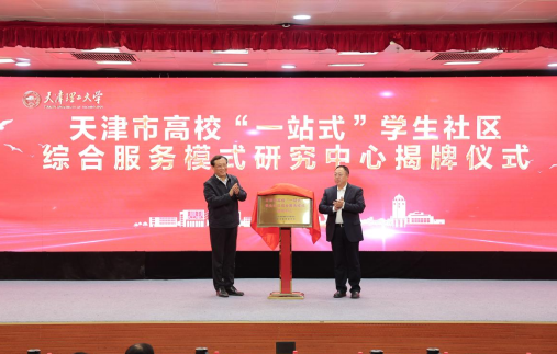 市教委副主任王秋岩和校党委书记刘东志共同为天津市高校“一站式”学生社区综合服务模式研究中心揭牌。