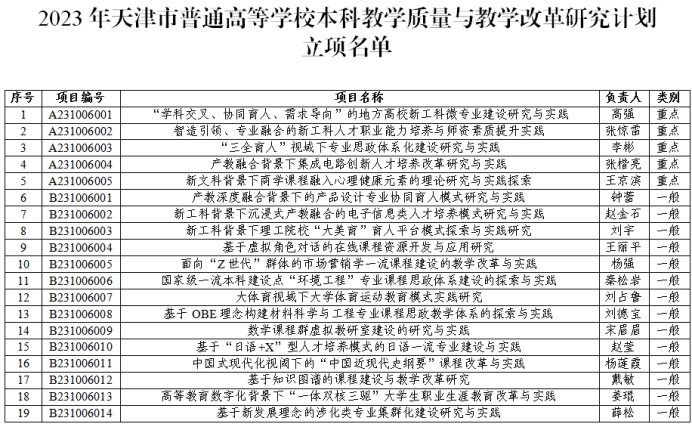 近日,天津市教育委员会印发《市教委关于公布2023年天津市普通高等学校本科教学质量与教学改革研究计划项目立项结果的通知》(津教政办〔2023〕139号),米兰共推荐申报项目20项,19项获批,其中重点项目5项,一般项目14项,位列市属高校前列。