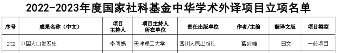 近日,2022-2023年度国家社科基金中华学术外译项目立项名单公布,全国共有234项课题获批立项,天津市获批7项,米兰语言文化学院日语系副教授李凤娟日译的《中国人口发展史》项目获批立项。