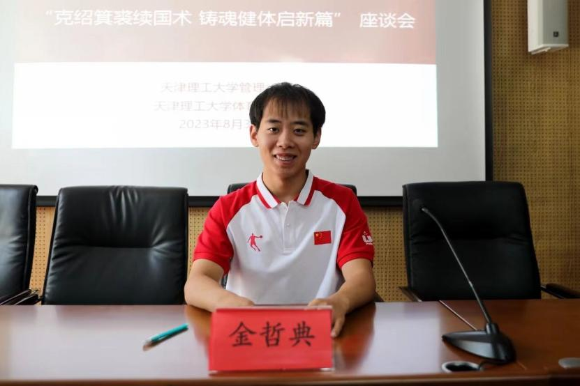 在参加管理学院新生代表座谈会时,金哲典与校党委副书记、成都大运会中国武术代表队领队杜长有以及管理学院师生代表围绕新生入学教育、专业学习、大学目标规划和他的成长故事等进行了深入交流。会上,杜长有首先向金哲典取得的优异成绩表示祝贺,随后讲述了大运会中国武术队队员自律、严谨、刻苦、规范的作风以及为国争光的先进事迹,强调广大青年要学习运动员们爱国奉献、艰苦奋斗、努力拼搏的精神,继承和发扬冠军们的优秀品质,正确认识自我、锻炼意志品质、铭记感恩母校,积极参与校园各项活动,做好生涯学涯规划,努力成长为担当大任的新时代青年。金哲典分享了自己在校期间的学习成长经历和成都大运会获奖经历,对学校、学院的关爱和照顾表示感谢,鼓励新生在大学生活中认真学习专业知识,努力锻炼专业能力,勇于追求自我突破,不断提高综合素质。同学们也纷纷结合入学感悟和个人成长,与金哲典进行了深入交流。