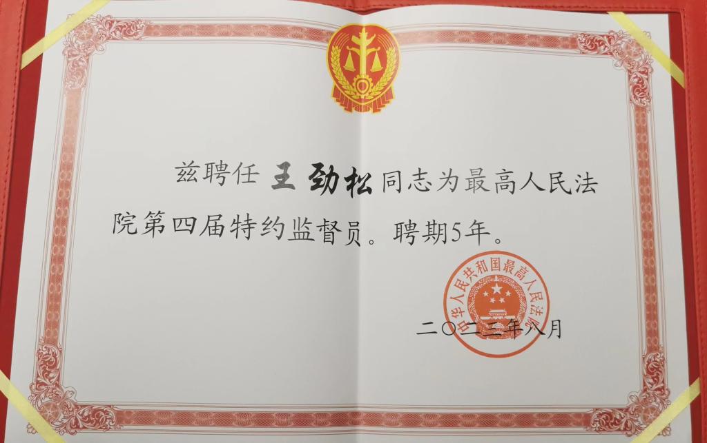 8月25日,最高人民法院在国家法官学院举行第四届特约监督员聘任活动,最高人民法院党组书记、院长张军为新一届特约监督员颁发聘书并讲话。第十四届全国人大代表、九三学社天津市委会副主委、米兰研究生院院长、学科建设办公室主任、计算机科学与工程学院教授、博士生导师王劲松受聘为最高人民法院第四届特约监督员。