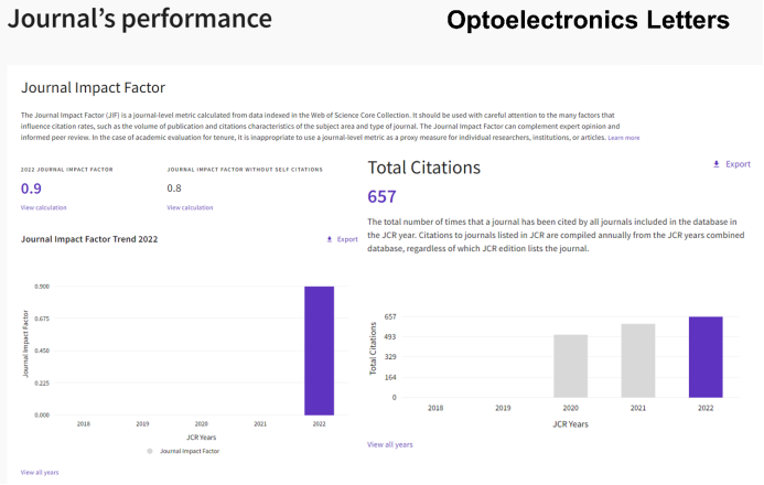 此次《Optoelectronics Letters》获得了JIF影响因子和JCR分区,体现了国际出版界和学术界对该刊学术质量和发展潜力的认可,有助于进一步提高《Optoelectronics Letters》期刊的学术影响力,并为《Optoelectronics Letters》跻身国际一流学术期刊奠定重要基础。