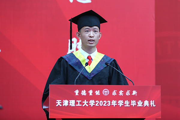 研究生毕业生代表、材料科学与工程学院博士研究生荣鑫在发言中分享了自己的科研感悟,表达了对学校和老师们的感恩之情和崇高敬意。她号召大家秉承勇攀高峰、敢为人先的科研精神,不忘新时代青年的责任与担当,为中国式现代化建设贡献青春力量!