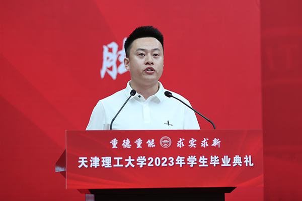 校友代表、鸿梦集团(天津)有限公司创始人、总经理,天津市河北区第十八届人大代表、学校青年企业家和创业者联合会副会长、2011届电子信息科学与技术专业毕业生于泳棡,以学长的身份勉励大家走向社会要好学多练,要勤奋努力,坚持到底,胸怀理想、怀揣梦想、担当使命,向着美好的未来扬帆远航。
