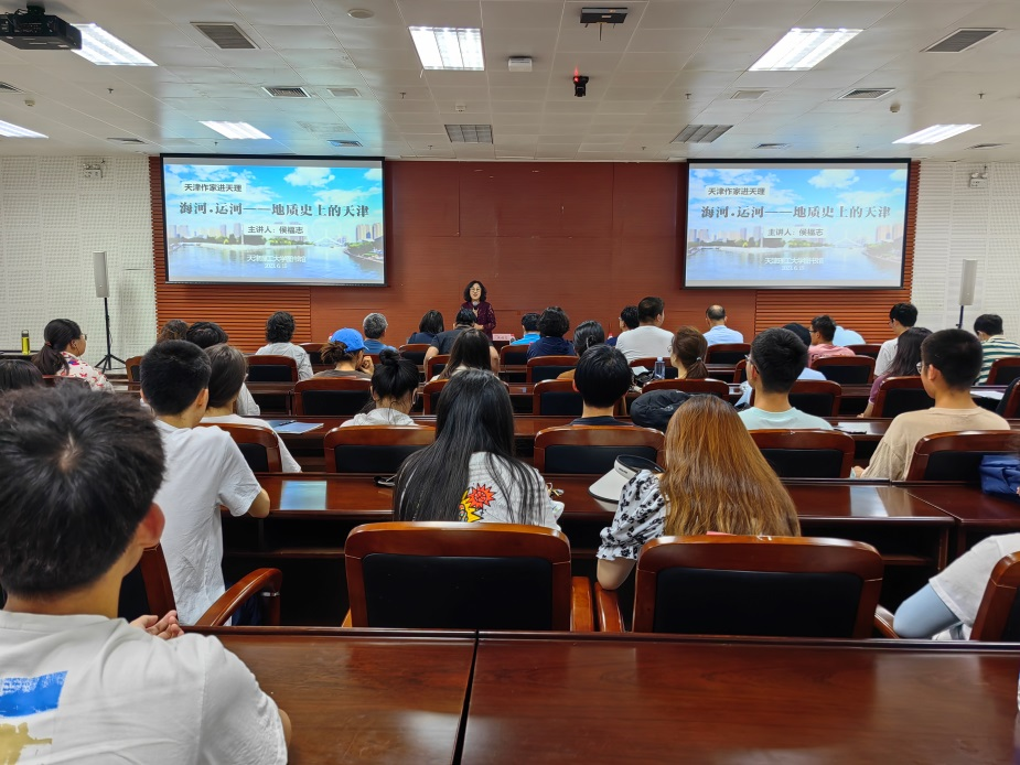 讲座围绕天津的地质变迁、地质遗迹、矿产资源、地质史和气候变化等内容展开,结合文献记录和调查报告等资料,图文并茂地带领大家感受了天津的地质文化,了解了天津的母亲河——海河和大运河。