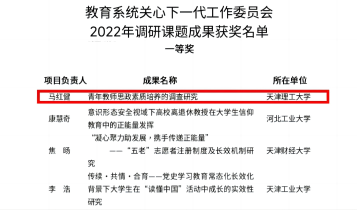 日前,市教育系统关工委下发《关于教育系统关工委2022年调研课题评审奖励的决定》(津教关〔2023〕7 号),米兰马红健老师申报的《青年教师思政素质培养的调查研究》调研课题荣获调研课题成果一等奖。