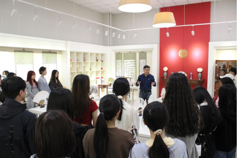 活动由扇面艺术讲解、学生作品点评及互动交流三个环节组成。相关教师向大家介绍了文人扇的构成、种类及文化内蕴。结合现场作品的创作理念、表现形式和审美取向,阐释了诗、书、画、印的内在关联和人文情怀。