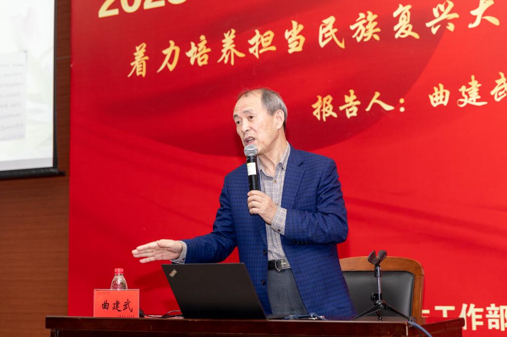 曲建武结合自己40多年的高校辅导员工作经历,饱含深情地向大家讲述了一张张温馨感人的照片、一封封情真意切的信件、一次次不远万里的家访、一项项真诚关爱的资助背后的故事。他通过丰富的案例、珍贵的照片,与学生相处的动人故事,与大家分享了他在大学生思想政治教育工作中的经验和思考,让大家深刻感受到“爱生如子、严爱相济”的职业追求,“求真务实、甘为人梯”的精神品格,“为党育人、为国育才”的崇高境界。