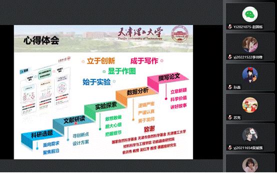 随后,来自材料科学与工程学院、化学化工学院、新能源材料与低碳技术研究院、功能晶体研究院等12名硕士研究生从不同的学科方向和主题进行学术汇报并分享科研工作体会和经验。同学们就课题来源、材料制备、组织表征、性能测试、器件合成、产业应用等关键科研问题,在与专家和同学的讨论中使理论知识实现内化,创新意识得到提升。