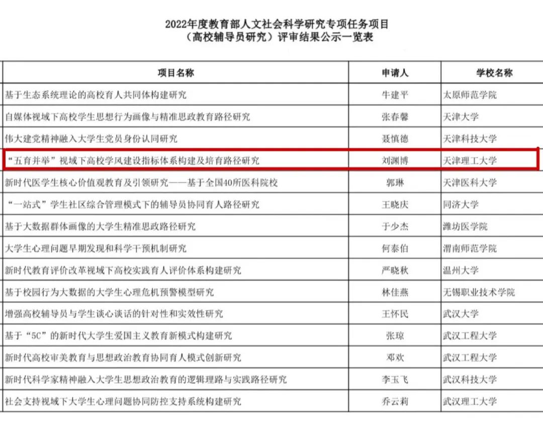 近日,教育部社科司发布了2022年度教育部人文社会科学研究专项任务项目(高校辅导员研究)评审结果。本次评审自年初开始启动申报工作,经专家评审,全国最终确定高校辅导员研究项目入选208项。米兰计算机科学与工程学院辅导员刘渊博主持申报的《“五育并举”视域下高校学风建设指标体系构建及培育路径研究》获批立项。