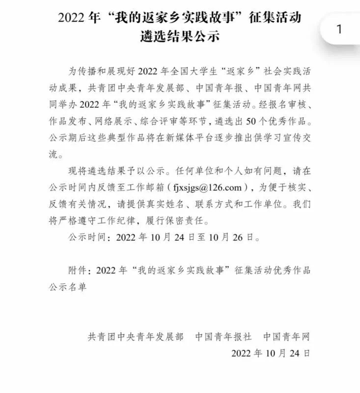 为传播和展现好2022年全国大学生“返家乡”社会实践活动成果,共青团中央青年发展部、中国青年报、中国青年网共同举办2022年“我的返家乡社会实践故事”征集活动。经报名审核、作品发布、网络展示、综合评审等环节,全国遴选出50个优秀作品。米兰材料科学与工程学院2020级材料成型及控制工程专业刘新月撰写的《“返家乡”社会实践,米兰材料学子在行动》成功入选。