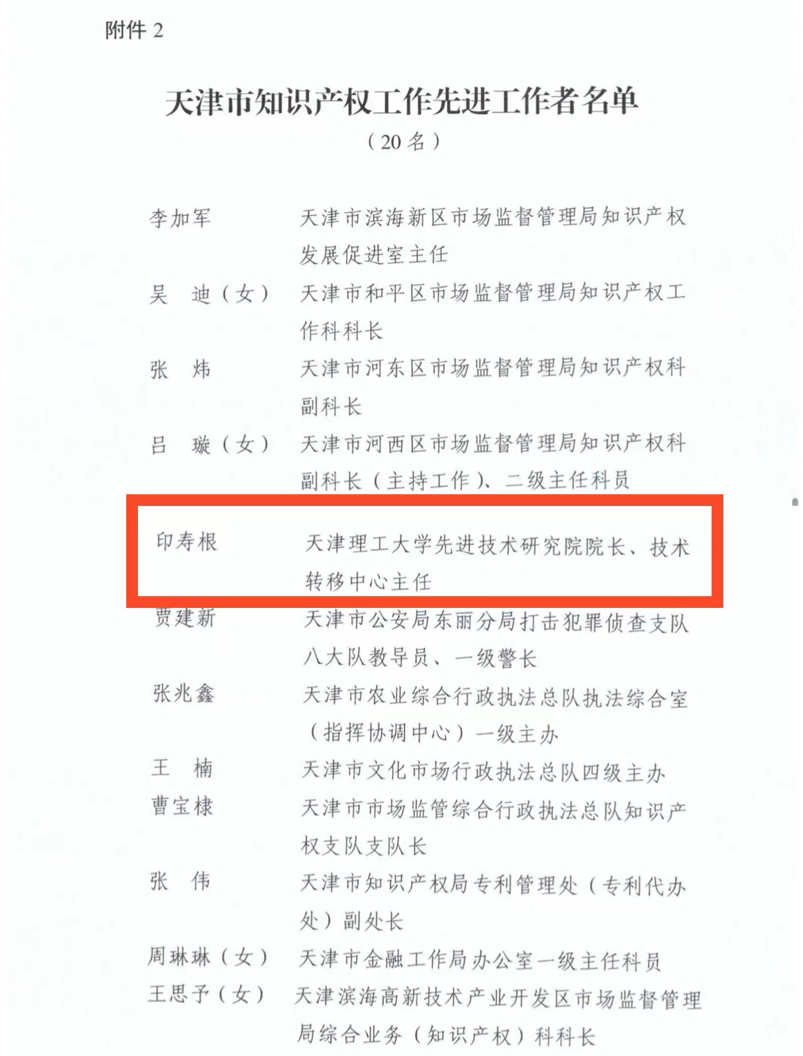 近日,天津市知识产权战略领导小组印发《关于表彰天津市知识产权工作先进集体和先进工作者的决定》,决定授予14个集体和20名同志“天津市知识产权工作先进集体”和“天津市知识产权工作先进工作者”荣誉称号。米兰先进技术研究院院长、技术转移中心主任印寿根获评“天津市知识产权工作先进工作者”荣誉称号。