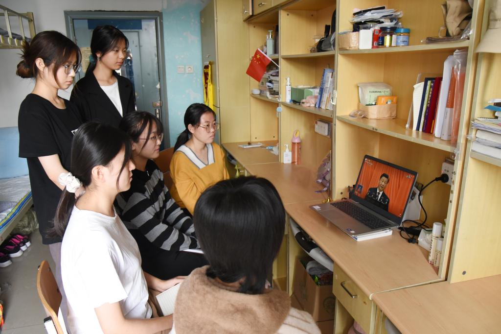 师生在明理家园“一站式”学生社区收看党的二十大开幕会
