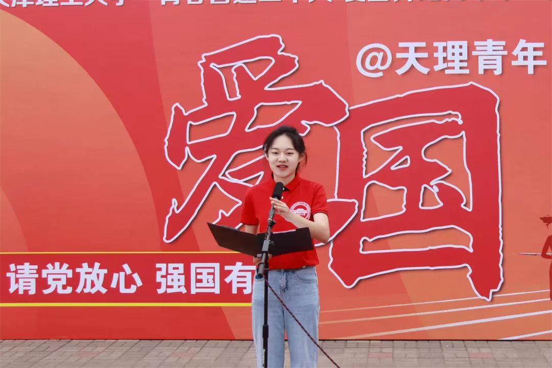 学生代表、管理学院2020级本科生王润带领大家面向10.1米的巨幅国旗许下“请党放心,强国有我”的青春誓言,点燃师生的爱国热情。