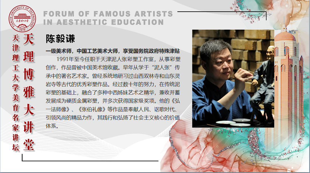 陈毅谦大师讲座主题为《从抟土造人到异金赋彩》,他怀着对泥人张彩塑的热爱与传承创新的执着,从泥人张彩塑的历史沿革和艺术特征展开,讲述创始人张明山艺术创作的初衷和泥人张历经六代传承的曲折动人故事。